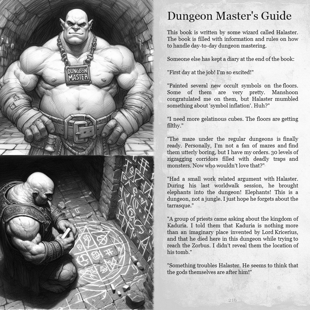 This is a sketch art & lore book for the video game Zorbus. There are big spoilers in the book! The illustrations are AI generated, so don't be surprised to see missing fingers or other oddities in the images. See below for the table of contents and some sample images. The PDF was created from images with ImageMagick, so all text is graphics and not super sharp, but I think it adds to the sketch book / old tabletop RPG rulebook style & feel that I was aiming for. Flipbook script from Chaitanya. |
